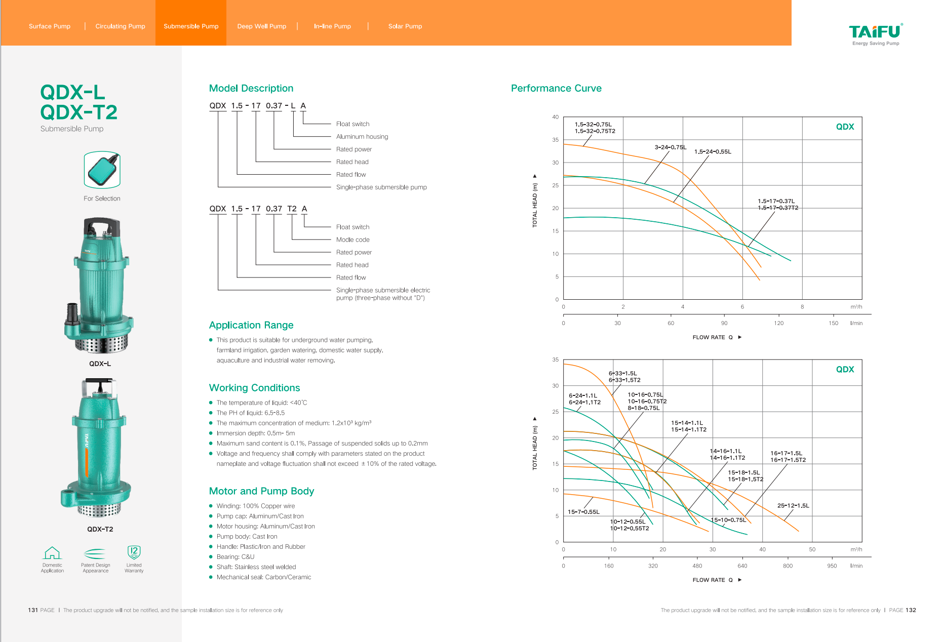 | TAIFU QXD1.5-32-0.75 SUBMERSIBLE HEAD MAX 33M 1PH PUMP C/W 10M CABLE |